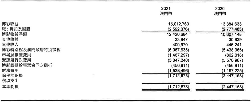 直至2021年12月31日,公司博彩收入約為124.2億澳門元,較2020年同比增長17%。直至2021年12月31日,虧損約為17.1億澳門元,2020年同期虧損則為24.5億澳門元。