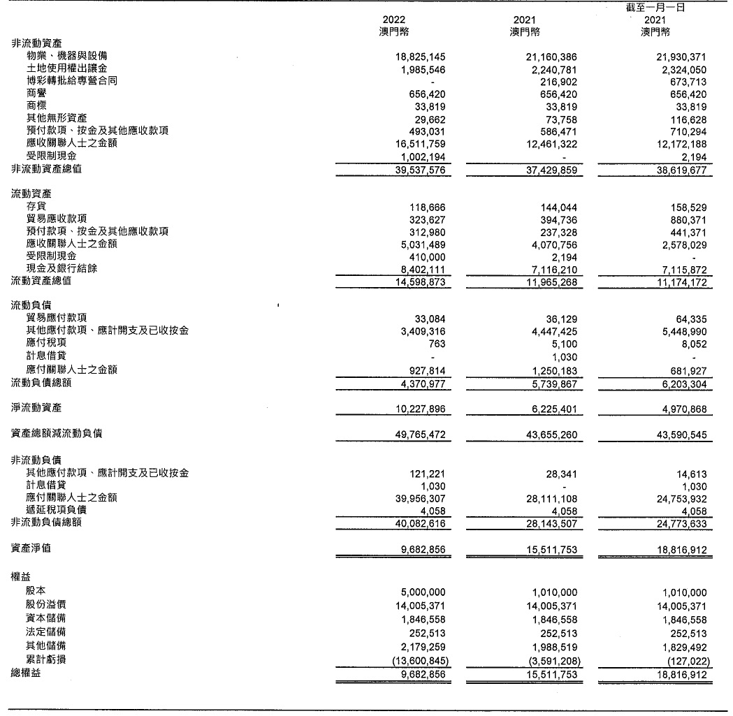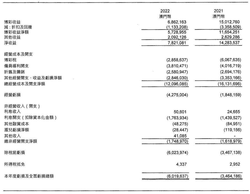 直至2022年12月31日,公司淨收益約為65.5億澳門元,較2021年同比下降49%。直至2022年12月31日,虧損約為29.4億澳門元,2021年同期虧損則為17.1億澳門元。
