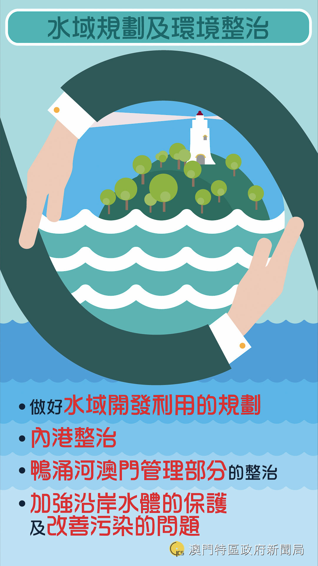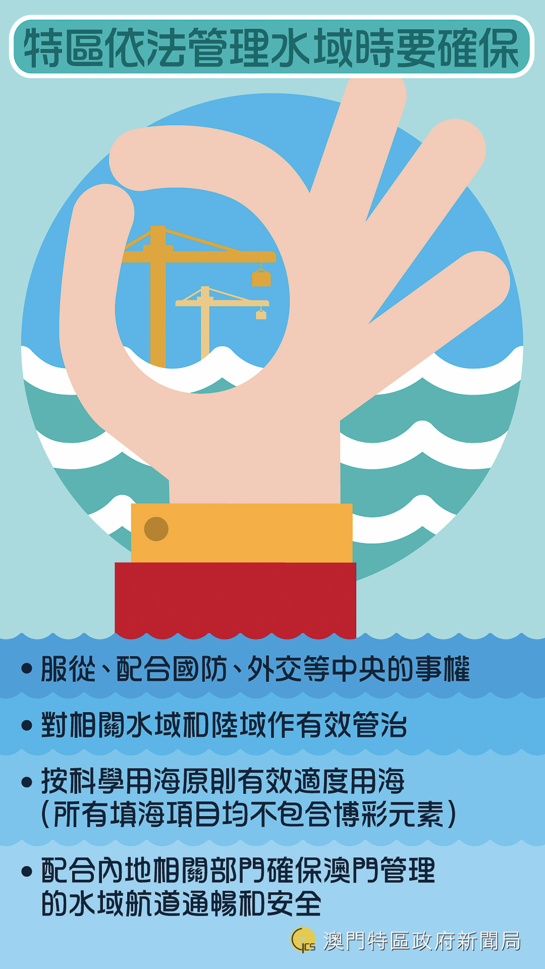 澳門特區管理的水域屬於國家所有,特區依法管理水域時要確保下圖中的4點原則: