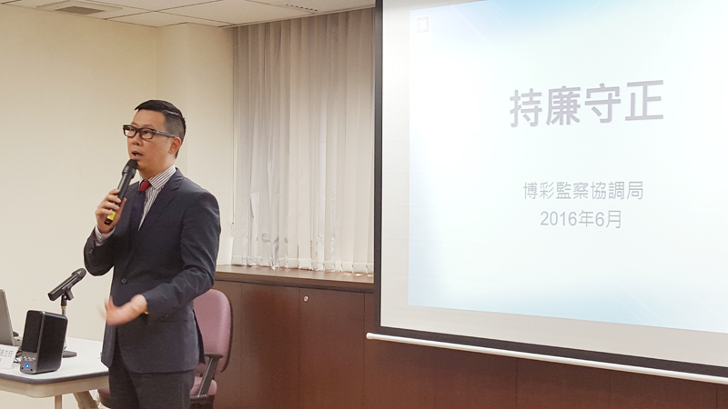 博彩監察協調局一直高度重視且嚴格要求全體人員盡忠職守及廉潔奉公,而為鞏固和提升人員的廉政意識,特邀廉政公署代表於5月18日及6月1日為局方逾一百二十多名督察舉行《持廉守正》專題講座。
